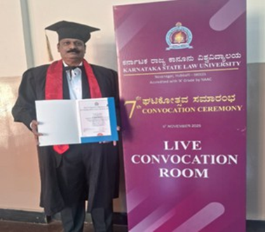 I am happy to share that I have completed my Bachelor of Laws (LLB) degree from Karnataka State Law University (KSLU), Hubbali. I graduated on 5th November 2025 during the 7th Convocation Ceremony held at the University of Agricultural Sciences, Dharwad. This achievement reflects years of hard work, dedication, and a strong interest in understanding justice and the legal system.