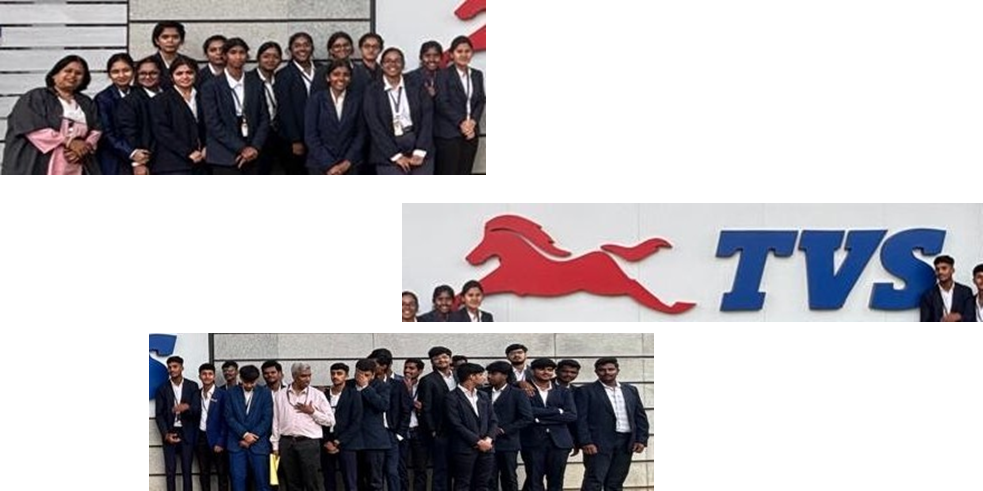1. INDUSTRY VISIT TO TVS MOTOR COMPANYAs part of the academic curriculum, students visited the assembly unit of TVS Motor Company located at Attibele, Hosur, on 12 January 2026. TVS Motor Company is one of the leading names in the Indian automobile industry and is widely known for its operational efficiency, strong quality standards, and disciplined organizational culture. The visit was well organized and informative, providing students with an opportunity to observe real-time industrial operations and understand how various departments work together to ensure smooth functioning.