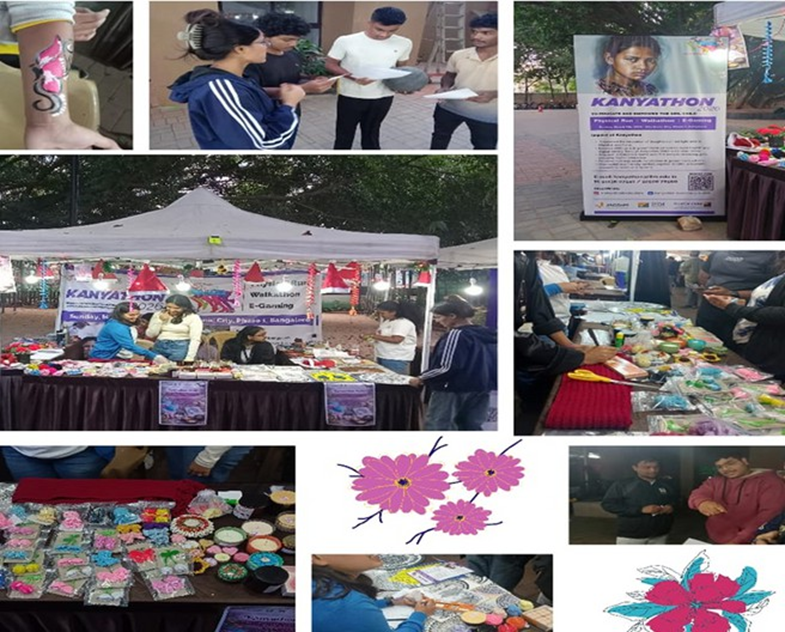 5.KANYATHON OUTREACH STALLS AND COMMUNITY INTERACTIONAs part of the Kanyathon awareness campaign, outreach stalls were organised at various community locations to extend the initiative beyond the campus. These stalls served as interactive platforms where students directly engaged with the public, explained the objectives of Kanyathon, and encouraged community participation. One of the key outreach activities included the Kanyathon Stall set up at Ajmera Apartment, where students interacted with residents and created awareness about women empowerment, health initiatives, and social responsibility. Similar outreach efforts at residential communities helped strengthen public visibility and involvement.
